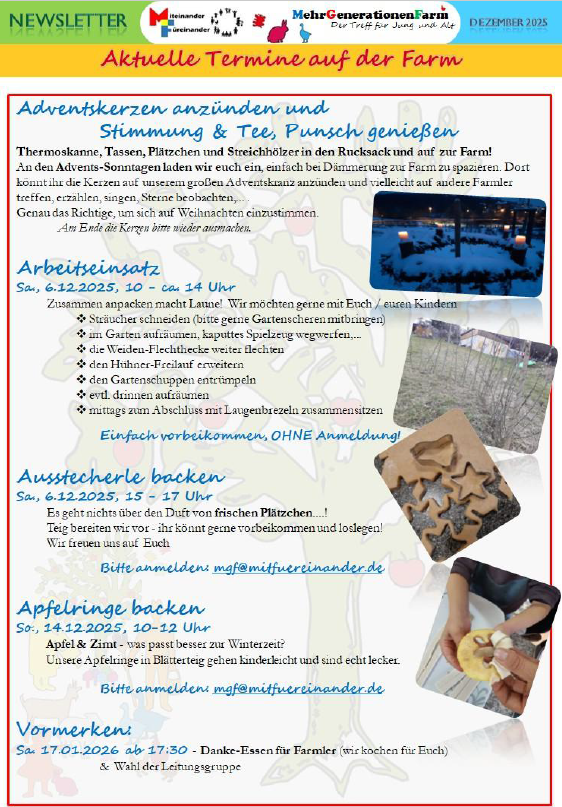 Die Adventszeit ist da, auf der Farm wird es winterlich, und die Hühner gehen schon vor 17 Uhr auf ihre Schlafplätze. Wer sich vom Wetter nicht abhalten lässt, ist herzlich eingeladen bei uns vorbeizuschauen - im Dezember Newsletter findet ihr unsere Angebote und andere Infos. Wir freuen uns auf Euch!