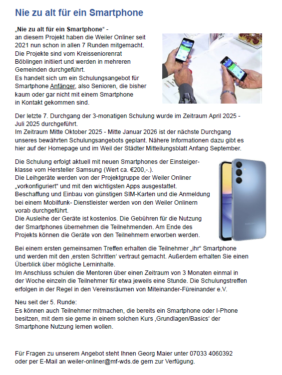 „Nie zu alt für ein Smartphone“ lautet der Titel unseres 3-monatigen Schulungsangebots für Smartphone Anfänger, initiiert vom Kreisseniorenrat Böblingen.