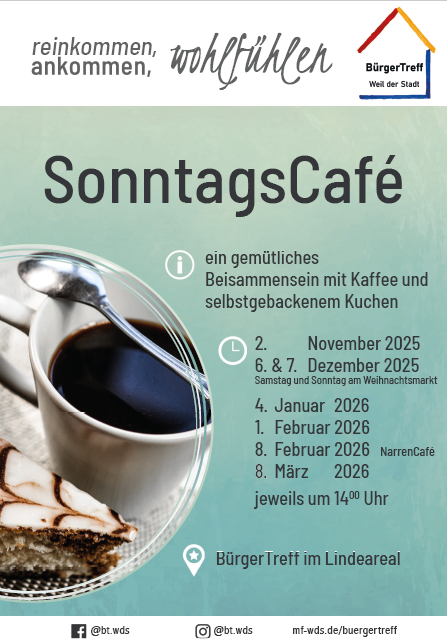 Auch in diesem Jahr kann im BürgerTreff das SonntagsCafé wieder angeboten werden. Dank vieler Unterstützer öffnet das SonntagsCafe jeweils am ersten Sonntag im Monat bis einschließlich März um 14 Uhr. Bei selbstgebackenem Kuchen und fair gehandeltem Kaffee oder Tee eine schöne Gelegenheit, mit Feunden und Bekannten den BürgerTreff zu besuchen. Gerne können die Besucher neue Ideen "mitbringen". Alle Verantwortlichen wollen die Attraktivität der BürgerTreffs ausbauen und zu einem gesellschaftlichen Treffpunkt im Städtle machen.