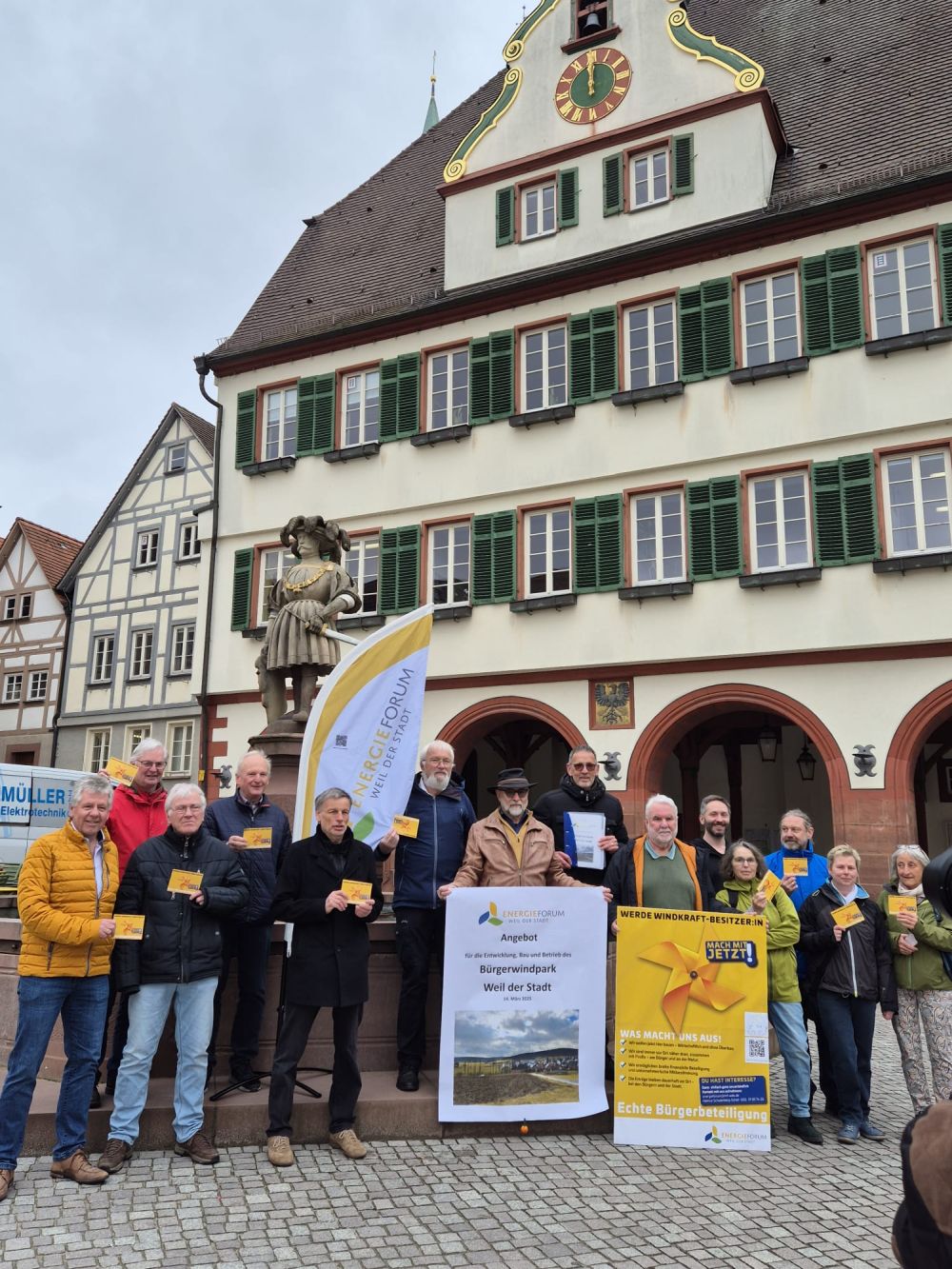 Die Stadtverwaltung und der Gemeinderat hat mit einer externen Beratung ein Verfahren zur Vergabe der städtischen Flächen in den Windvorranggebieten BB-02 und BB-27 vorbereitet. Dies geschieht vorbehaltlich der Entscheidungen der Regionalversammlung über die Windvorranggebiete. Voraussichtlich in den ersten Monaten des neuen Jahres kann man sich für die Anpachtung der Grundstücke bewerben. Wir bereiten uns zusammen mit der Gruppe Bürgerwind Heckengäu darauf vor. Als Bürger aus Weil der Stadt freuen wir uns auf Ihre Unterstützung. Auch die Nachbarkommunen Heimsheim und Simmozheim und ihre Bürger sollen beteiligt werden.